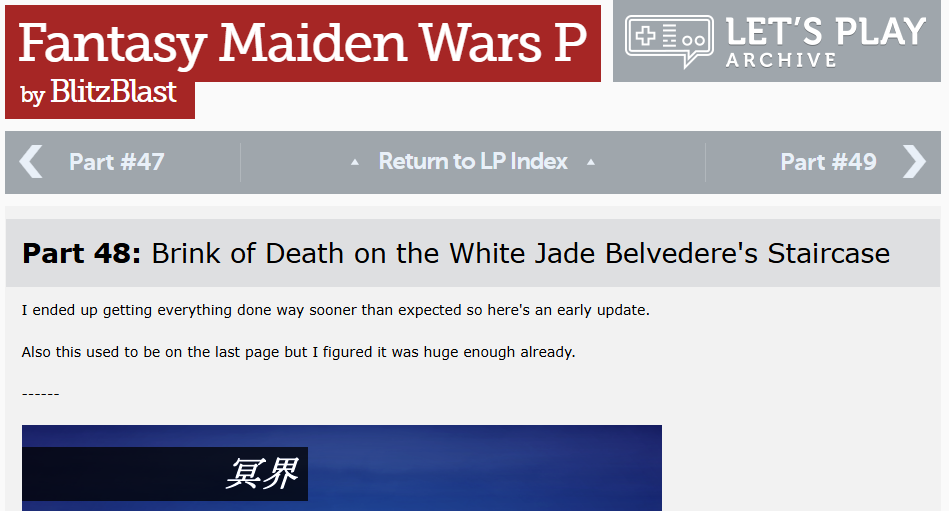 Battler: idk where to even begin here, lol. This all started as a mutual friend of ours, BlitzBlast, just playing through FMW1 (after a different group made a patch for it) and talking about it in our IRC channel. I remember laughing at him getting frustrated about the RNG a lot. That eventually turned into a Let’s Play on the Something Awful forums, which he handled through the first three games, before I picked up the torch for the 4th. I started venturing into the world of translation work a bit later, eventually being brought by Christina to help with Lotus Labyrinth R. Then, like midway through that project, Sanbon-san himself contacted me on twitter to inquire about our fan translation. Needless to say, I was bouncing off the walls. That was so long ago now… man, we really did have to translate a lot of text, didn’t we?