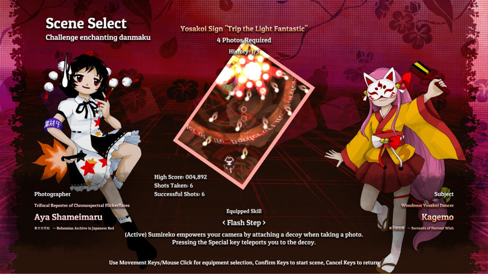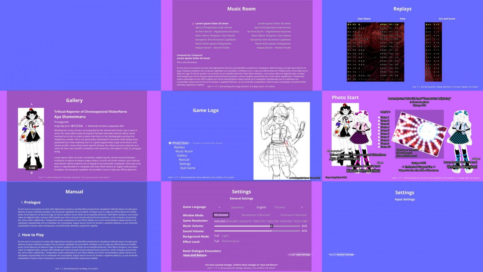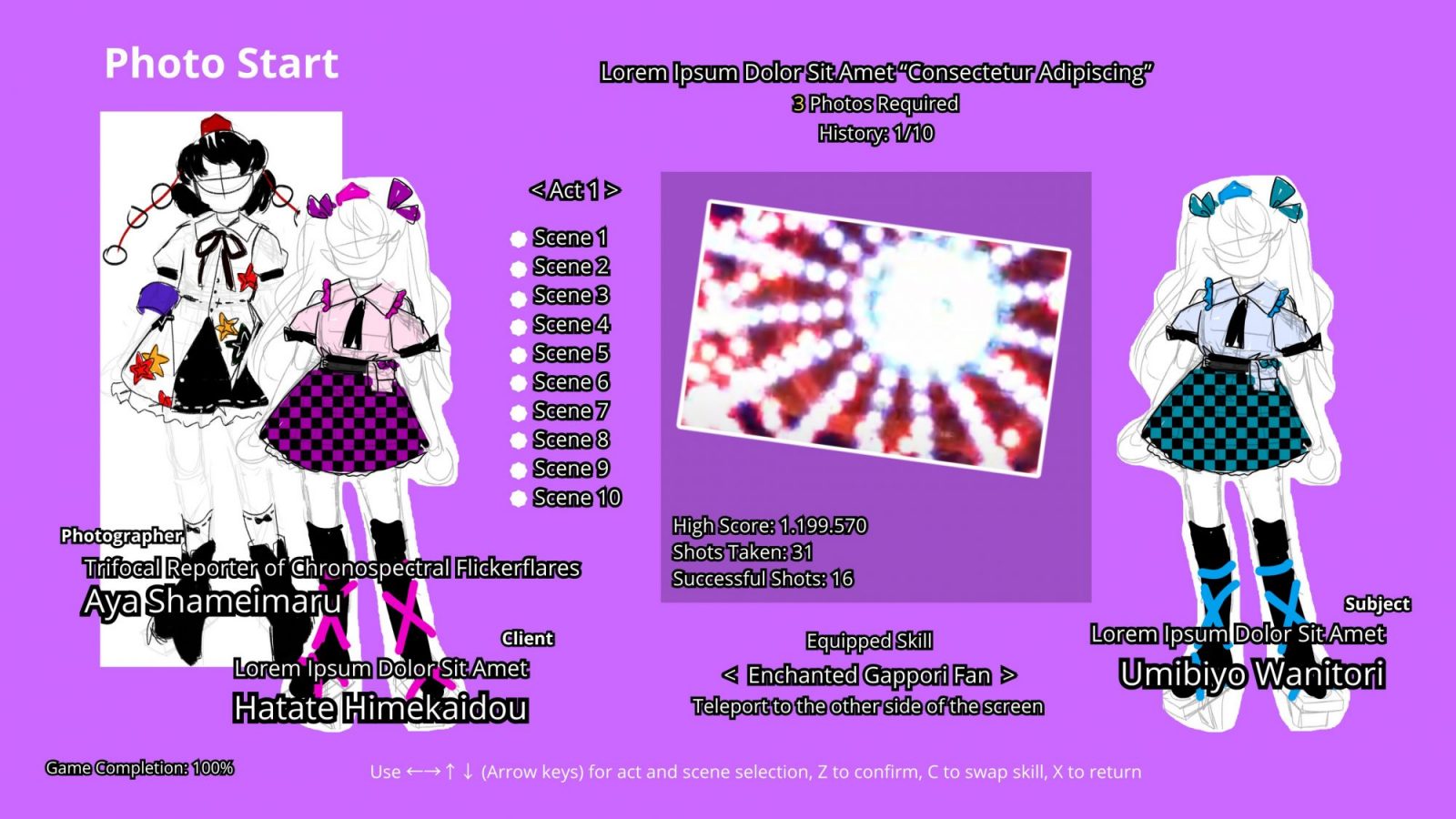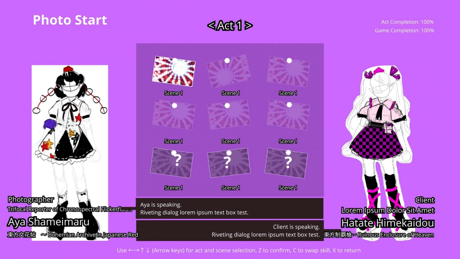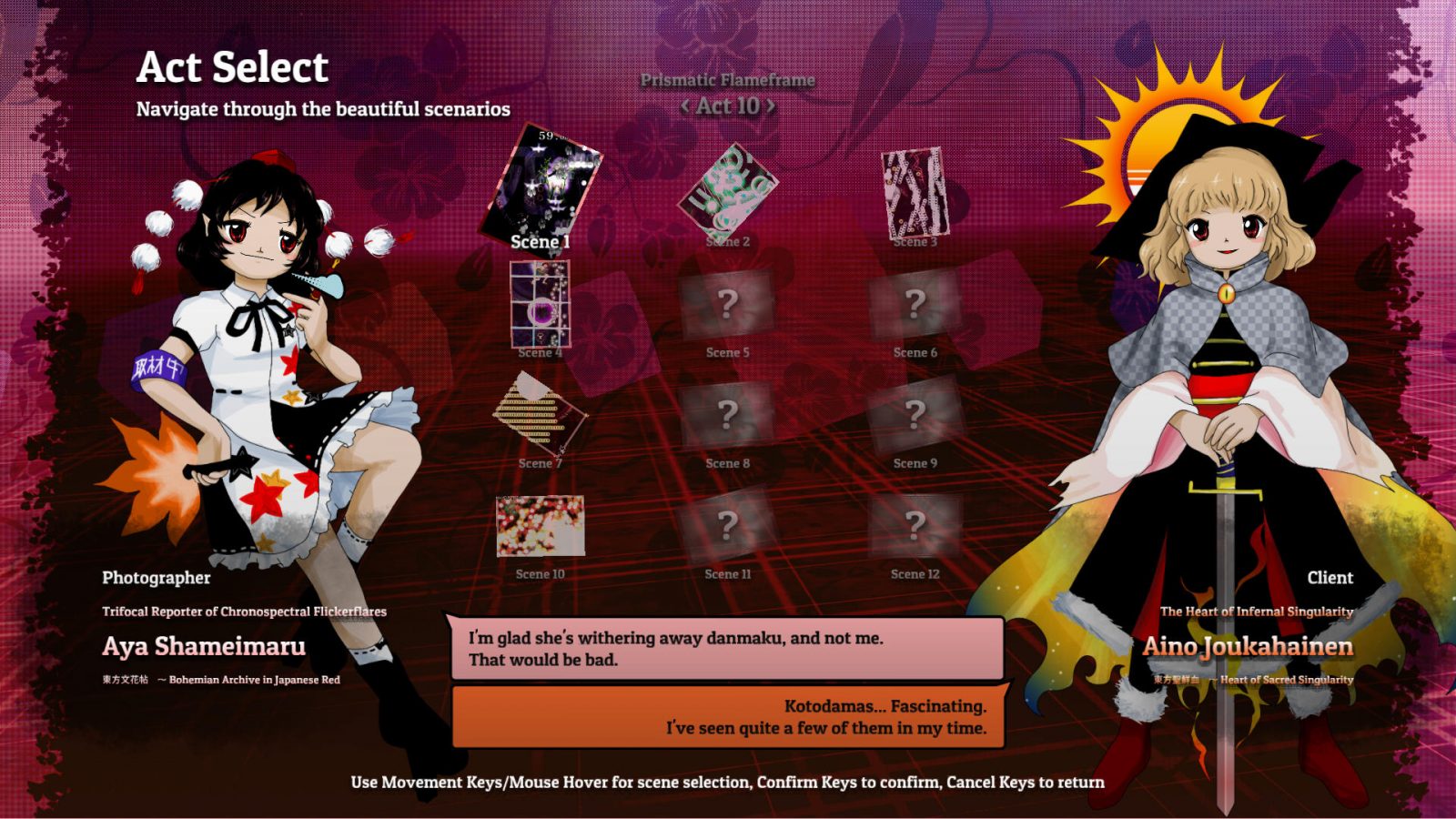 However, the act and scene selection menu is definitely the one that is the highlight of changes. As you can see, originally, following more so the menu styles of the official photography games like ダブルスポイラー ~ 東方文花帖 or 秘封ナイトメアダイアリー 〜 Violet Detector, the selectable content was all in a single screen. It’s definitely a minus one button count compared to the released version, but we felt like it was incredibly cluttered.