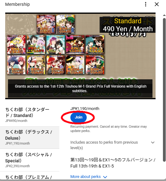 While there are 5 membership tiers for the channel, only 2 are relevant for English speakers, the standard and the deluxe membership. For 490 yen (less than $5), the standard membership gives you access to the full version of the first twelve M-1 Grand Prix available on YouTube, allowing you to also view the opening, in-between, and ending segments instead of only the skits.