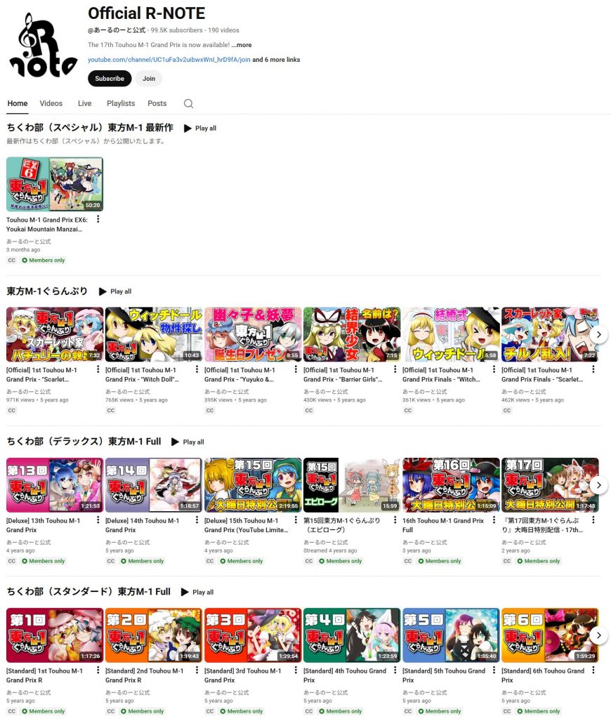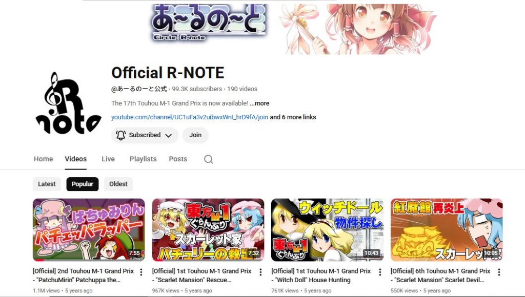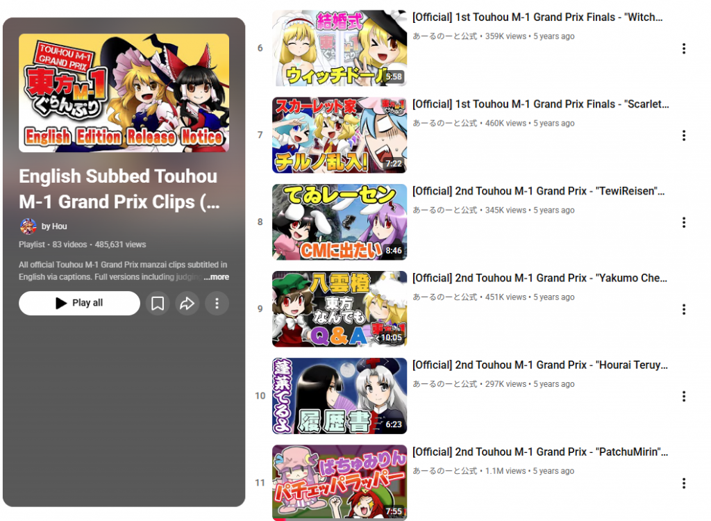 Hou : The main extent of what I do is trying to ensure that announcements of new releases get announced by R-note in English. Things like making sure YouTube broadcasts have their titles and descriptions translated is also important, as it’ll help things pop up in YouTube recommendations. I also made an English playlist with all of the official free clips. It’s gotten a surprising amount of views.YouTube also recently automatically applied auto-dubbing to a bunch of the Touhou M-1 videos and so I asked R-note to painstakingly go through them one-by-one and disable it on every video.