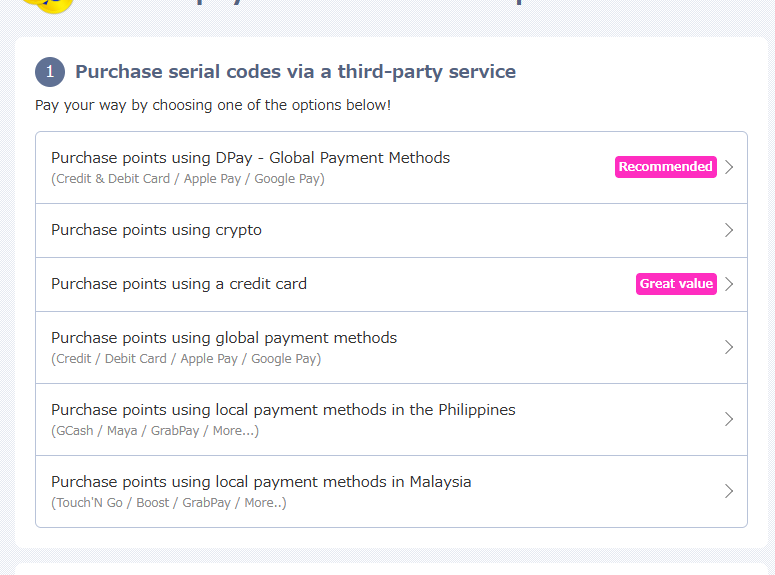 - Select your preferred method for purchasing points.