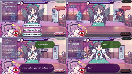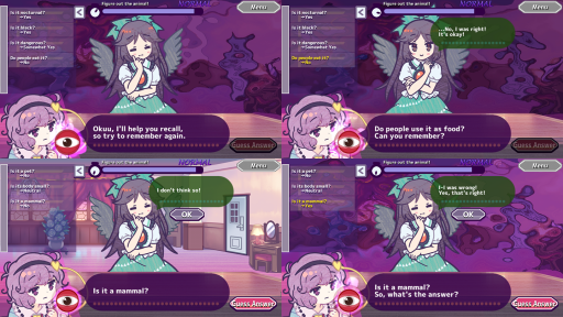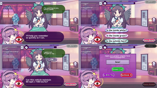 Satori has overworked herself for too many days straight and finds herself unable to fully use her mind-reading powers, but Okuu needs help remembering things, like which kind of vegetable she’s supposed to go out and buy, or which type of animal youkai she scheduled a job interview for. With Satori’s powers mostly unusable, you’ll have to rely on logic to figure out the answer by asking Okuu questions.