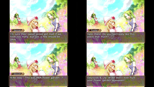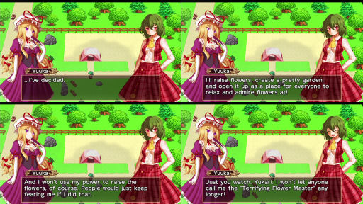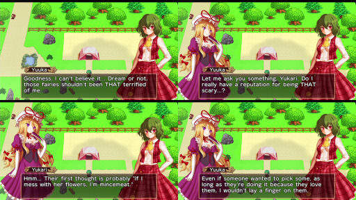 Unlike Harvest Moon, there’s no gifting or romance, but you can still raise your friendship with characters by talking to them daily. Characters will give you seeds or recipes once you get close enough to them, and some characters have special events, too. The game has a total of 17 different endings, many of them featuring characters that we’re not used to seeing Yuuka interact with (though the list of characters we HAVE seen her interact with in canon is admittedly pretty small).