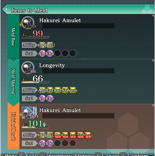 Some advance dungeons are hard to beat with simply raw equipment, which leads us to talk about Nito Fusion’s final option, Melding. Melding is the last unlockable function of Nito once you’ve progressed the story enough. Melding allows you to combine weapons and be able to transfer yellow seals to another weapon. The base equipment also needs to be max level before it can be used, but the materials used to combine with it can be any level. The base equipment also gains a portion of the material’s stats and experience, and increases its equipment’s level cap by 10. It requires a lot of Nito Points, but also provides the player with very powerful equipment as they progress. Melding can also further improve the yellow seals of the base equipment. Like Fusion, you can only meld similar types of equipment: you can only meld armor with armor, weapon with weapons and charm with charms.