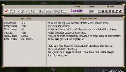 As said before, GensoWanderer -Reloaded- is a Roguelike game, hence the following will apply. Some dungeons will have a unique set of rules or conditions that can alter the basic rules as you progress.