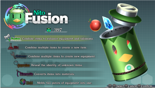 Later, as you progress the story, you will be given the ability to use Nito Fusion! Nito Fusion is an integral part of the game that allows you to create, combine and dismantle materials in order to get what you want and need. You need to use Nito Points, which you occasionally find lying on the ground to be collected, or by dismantling objects. You will use it a lot in this game but basically put, it has 5 basic functions that you will use quite often: Fusion for combining your equipment, Mix for creating items such as potions, food, spellcards and gaps, Alchemy for creating equipment, and Dismantle to convert items and equipments to raw materials. Two more advanced functions, Appraise and Melding, are unlocked once you reach higher difficulties.