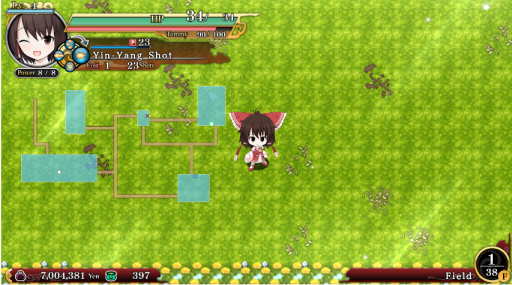 During dungeon adventures, you need to manage your character to prepare her for battles. You need to manage your health (your hitpoints) and Tummy (also called Hunger). Hunger decreases as turns pass, and once it drops to 0, you take 1 damage every turn. You can recover Hunger by eating foods you can see on the ground, or by drinking some potions. The characters in the game are also capable of using Danmaku, which varies from character to character, making them work differently than the others. Danmaku consumes “P” each time you use it, and each variety of Danmaku costs differently. Using it also passes a turn, so be sure to use it carefully and effectively! There is also the Power value seen under the character’s portrait. Power defines how much damage you can deal with your attacks and danmaku, and can be increased in some ways such as potions or equipment.