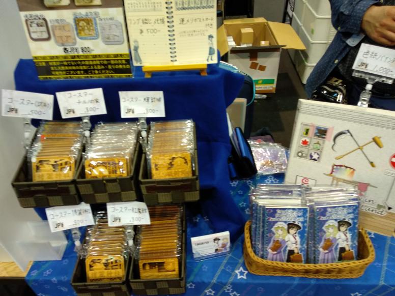 Travel-Planning of Takuhisa, who made the aforementioned Hifuu notebooks and Touhou coasters, told me that he had started making merchandise two years ago. He was upset that there were no large calligraphy boards, so he made some for himself and decided to sell them. A year ago, he decided to try his hand at making wooden coasters, and this year he came up with the idea of travel diary notebooks. We talked about our favourite characters, and he told me his preferences changed all the time, but that right now he was a fan of Kutaka Niwatari. At the end of our conversation, he also showed me that he had Hifuu themed car carpets, which were not on display.